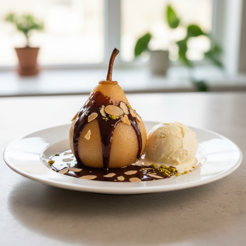 - Disposez une poire pochée dans chaque assiette. Ajoutez une boule de glace vanille à côté. Nappez généreusement la poire de sauce chocolat chaude. Parsemez éventuellement d’amandes effilées ou de pistaches concassées pour le croquant.