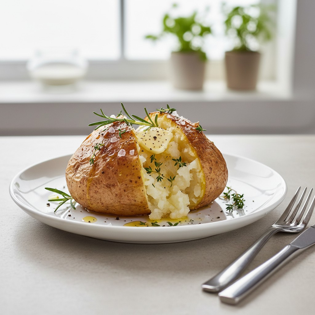 - Sortez les pommes de terre du four. Fendez-les en croix sur le dessus, pressez légèrement pour ouvrir la chair. Ajoutez un filet d’huile d’olive, une noisette de beurre, du poivre et éventuellement des herbes fraîches. Servez immédiatement.
