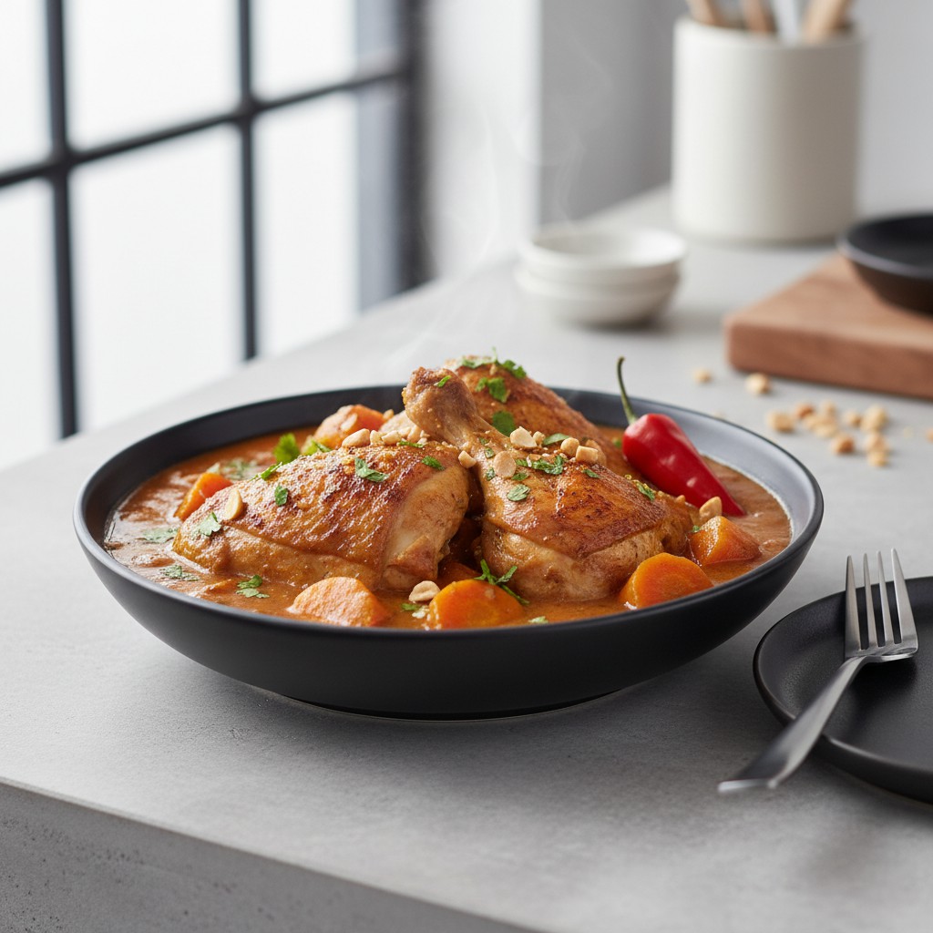 Le poulet mafé est un plat emblématique d’Afrique de l’Ouest, notamment du Sénégal et du Mali. Il s’agit d’un ragoût de poulet mijoté dans une sauce onctueuse à base de pâte d’arachide, de tomates et d’épices. Ce plat, à la fois riche et équilibré, séduit par sa profondeur aromatique, sa texture crémeuse et sa capacité à rassembler autour d’une cuisine authentique et conviviale. Le mafé est traditionnellement servi avec du riz blanc, et chaque famille possède sa propre variante. Cette recette met l’accent sur l’équilibre des saveurs, la maîtrise de la cuisson et la simplicité des gestes pour garantir un résultat savoureux et fidèle à la tradition.