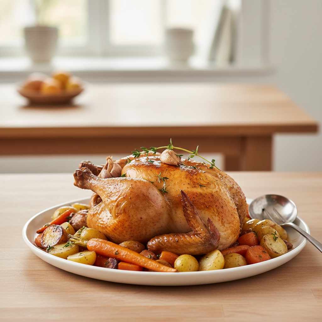 Le poulet rôti au four est un classique de la cuisine familiale française, apprécié pour sa simplicité, sa convivialité et sa capacité à sublimer une volaille entière avec peu d’ingrédients. Cette recette met en avant la justesse de la cuisson, le respect du produit et l’équilibre entre peau croustillante et chair moelleuse. Traditionnellement servi le dimanche, il incarne le repas de partage par excellence. Ici, chaque étape est expliquée pour garantir un résultat savoureux, juteux et sain, tout en évitant les pièges courants (séchage, manque de goût, cuisson inégale).