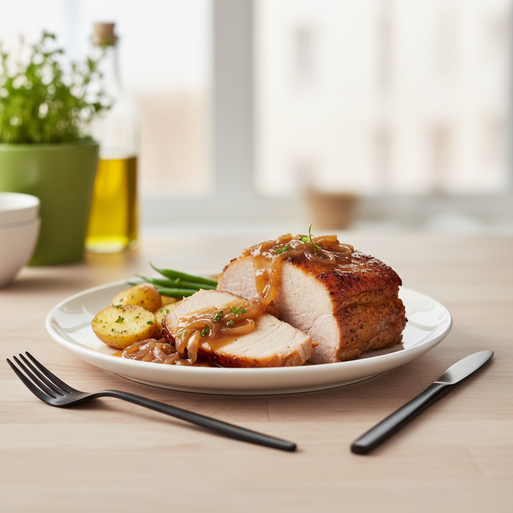 - Servez le rôti nappé de sa sauce aux oignons, accompagné de légumes de saison, de pommes de terre vapeur ou d’une purée maison.