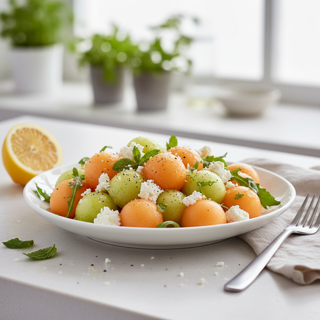 - 4. Assemblez la salade : Dans un grand saladier, mélangez délicatement les billes ou cubes de melon, la feta émiettée, la menthe ciselée et la roquette si utilisée. Ajoutez l’huile d’olive et le jus de citron. Mélangez brièvement pour ne pas écraser les ingrédients.