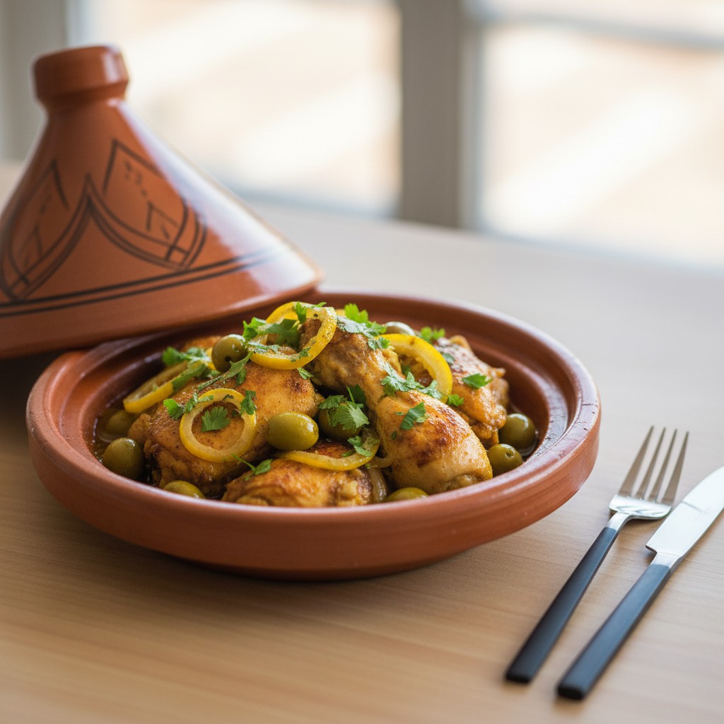 Le tajine de poulet aux olives et citron confit est un plat emblématique de la cuisine marocaine, réputé pour ses saveurs profondes, son équilibre entre acidité, salinité et épices douces. Ce plat mijoté, traditionnellement cuit dans un plat en terre cuite éponyme, offre une viande fondante et une sauce parfumée. Il illustre l’art du mijotage et l’importance de la patience en cuisine. Accessible, il permet de découvrir l’authenticité du Maghreb tout en restant équilibré : protéines maigres, légumes, peu de matières grasses et une richesse aromatique sans excès de sel. Originaire du Maghreb, le tajine est un symbole de convivialité et de partage, chaque famille ayant sa propre variante.