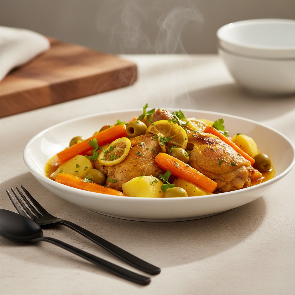 Le tajine de poulet est un plat emblématique de la cuisine maghrébine, réputé pour ses saveurs profondes, ses épices chaleureuses et sa cuisson lente qui sublime la tendreté de la volaille. Ce plat traditionnel, originaire du Maroc, doit son nom au récipient en terre cuite dans lequel il mijote. Il se distingue par l’équilibre entre le salé, le sucré et l’acidité, souvent apporté par des olives, des citrons confits et parfois des fruits secs. Accessible et convivial, le tajine de poulet est idéal pour un repas familial ou entre amis, tout en offrant un excellent équilibre nutritionnel grâce à la présence de légumes, d’épices et de protéines maigres. Cette recette vous guide pas à pas pour réussir un tajine authentique, en expliquant chaque geste clé et en proposant des alternatives santé ou pratiques.