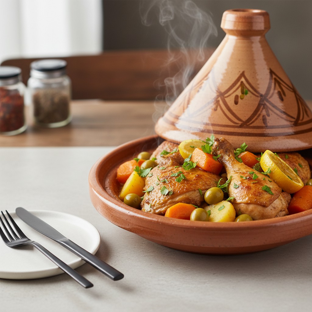 Le tajine de poulet est un plat emblématique de la cuisine maghrébine, réputé pour ses saveurs profondes, ses épices chaleureuses et sa cuisson lente qui sublime la tendreté de la viande. Ce plat traditionnel, originaire du Maroc, doit son nom au récipient en terre cuite dans lequel il mijote. Il se distingue par l’équilibre entre protéines, légumes et épices, offrant un repas complet, convivial et parfumé. La recette proposée ici privilégie la simplicité et l’authenticité, tout en intégrant des conseils de chef pour garantir une texture moelleuse du poulet, une sauce onctueuse et des légumes fondants. Elle met l’accent sur la maîtrise des épices, la gestion de l’humidité et l’art du mijotage, pour réussir ce classique dès la première tentative.