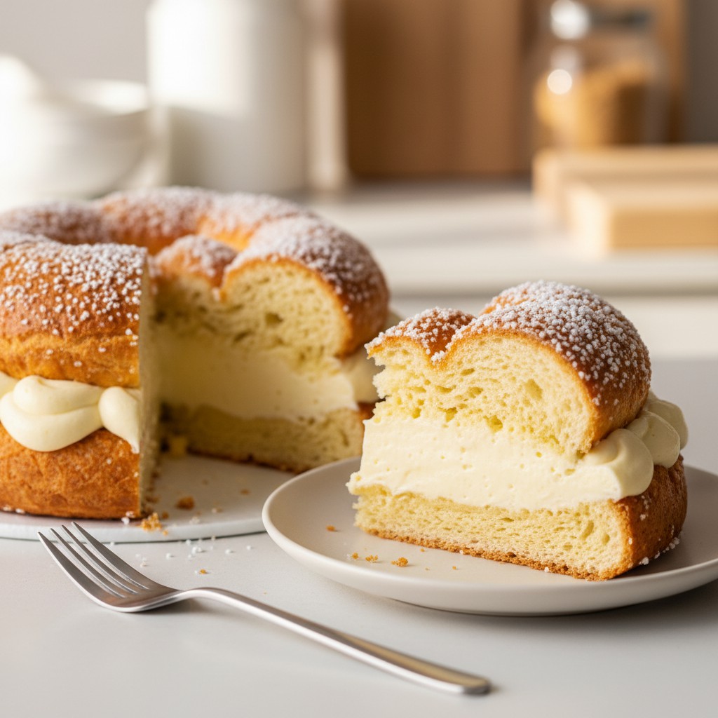 - Coupez la brioche refroidie en deux dans l’épaisseur avec un grand couteau à pain. Garnissez généreusement la base de crème tropézienne à l’aide d’une spatule ou d’une poche à douille. Replacez le dessus de la brioche. Réservez au frais au moins 1h avant de servir pour que la crème se tienne bien.
