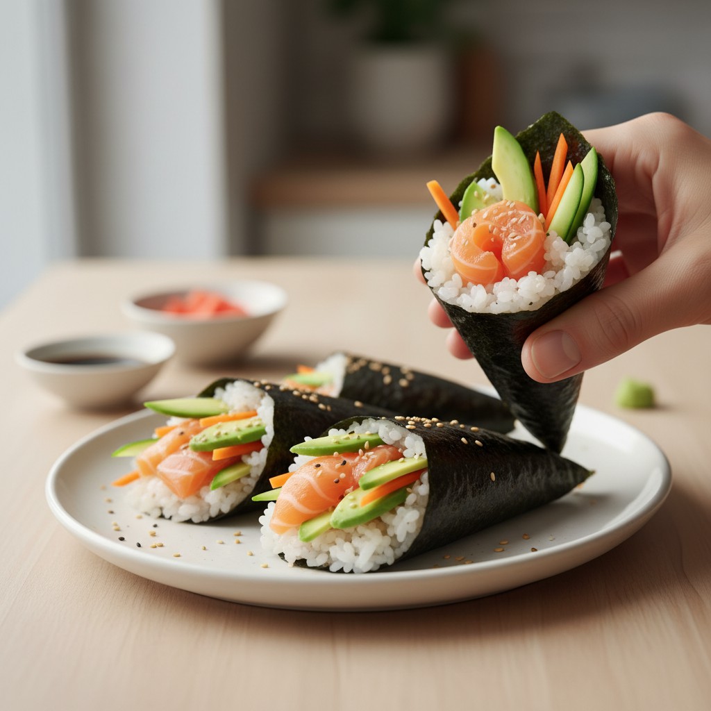 Le temaki est un sushi roulé à la main en forme de cône, emblématique de la cuisine japonaise conviviale. Il se distingue par sa simplicité de préparation, sa fraîcheur et sa personnalisation à l’infini. Chaque convive compose son propre temaki, ce qui en fait un plat idéal pour un repas interactif et décontracté. Traditionnellement, le temaki met en valeur la qualité du riz vinaigré et la fraîcheur des garnitures (poisson cru, légumes, omelette…). Il offre un équilibre nutritionnel intéressant : glucides complexes du riz, protéines maigres du poisson, fibres et vitamines des légumes, le tout enveloppé dans une feuille de nori riche en minéraux. Cette recette vous guide pour réussir un temaki authentique, en expliquant chaque geste clé et en proposant des alternatives pour s’adapter à vos goûts ou contraintes alimentaires.