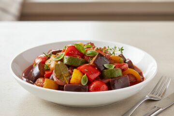 La ratatouille au vin est une variation raffinée du grand classique provençal. Ce plat mijoté, emblématique du sud de la France, associe aubergines, courgettes, poivrons, tomates et oignons, relevés ici par une touche de vin rouge qui apporte profondeur et complexité. Traditionnellement servie en accompagnement ou en plat principal végétarien, Lire la suite
